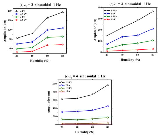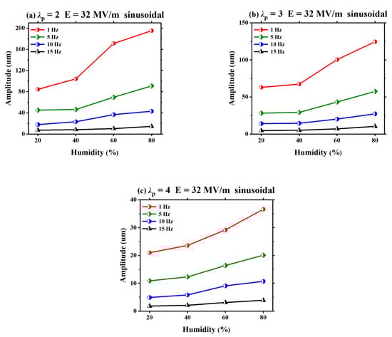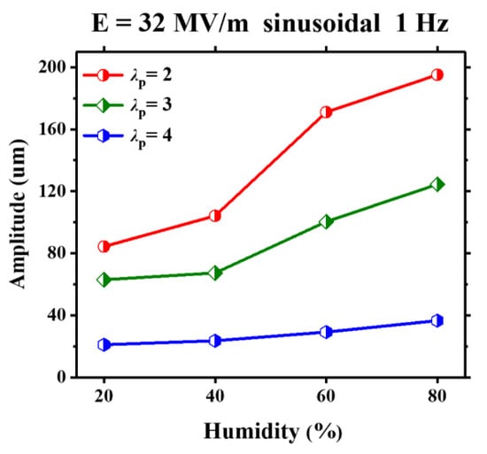 Finally, under three different pre-stretch ratios (λp = 2, λp = 3 and λp = 4), the humidity effect on the amplitude of VHB 4905 is investigated by using a sinusoidal voltage with four different frequencies, which is illustrated in Figure 7. Similar to Figure 5, under various humidity levels, the sinusoidal voltage with a low frequency generates a large amplitude. As the frequency increases, the amplitude drops sharply. When the frequency is up to 10 Hz, the produced deformation is extremely small. A similar phenomenon has been reported in the experiments of out-of-plane deformation [31]. Besides, for a given pre-stretch ratio, the amplitude adds up with the increasing humidity for all different frequencies, and a low frequency induces a rapid increase of the amplitude with the humidity.