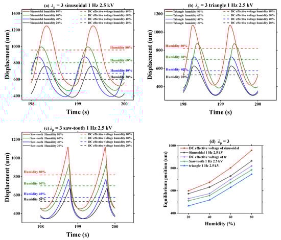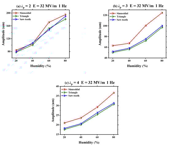 Similarly, under three different pre-stretch ratios (λp = 2, λp = 3 and λp = 4), the humidity effect on the amplitude of VHB 4905 is investigated by using three voltage waveforms, which is displayed in Figure 6. Under a given pre-stretch ratio, the amplitude of VHB 4905 increases gradually with the increasing humidity for all different voltage waveforms. Furthermore, it is found that the sinusoidal voltage can generate a relatively larger amplitude compared with those generated by triangle and sawtooth voltages. On the other hand, regardless of the pre-stretch ratio, the sawtooth voltage generally generates a slightly higher amplitude than that generated by the triangle voltage. The reasons are given as follows. Firstly, despite all the three waveforms having equal peak values, the effective value of sinusoidal voltage is higher, and has more energy. Therefore, the induced amplitude is larger. In addition, although the triangle and sawtooth voltage theoretically have the same energy, the impossible instantaneous jump from +2.5 kV to 0 kV leads to a slightly large energy of sawtooth voltage and induces a slightly-large amplitude.