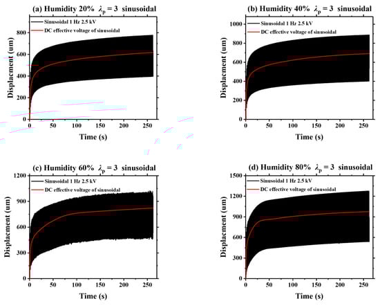 Comparison of the displacements between the effective DC signal and the sinusoidal signal under different ambient humidities.