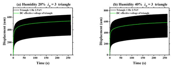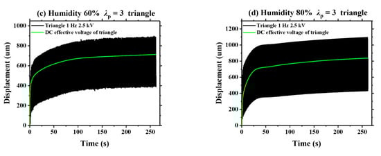 As is known, viscoelasticity is an inherent property of DE materials. In this section, we detect the humidity effect on the viscoelastic creep of VHB 4905 elastomer. Figure 8 displays the dynamic viscoelastic creeping of VHB 4905 (λp = 3) when a sinusoidal voltage with a frequency of 1 Hz and a peak voltage of 2.5 kV is applied. Meanwhile, the effective DC voltage of the applied sinusoidal voltage is calculated, and the static deformation of the effective DC voltage is simultaneously measured. Under different ambient humidities, the increase of viscoelastic creep deformation for the VHB 4905 membrane under sinusoidal voltage is similar to that under the effective DC voltage. It is noted that the slopes of displacement-time curves are continuously declining, implying a gradually-weakened viscoelastic creep deformation of VHB 4905 elastomer. Based on these characteristics, it can be predicted that such creeping can be eliminated if the testing time is long enough. Similar results can be found when the triangle and sawtooth voltages are applied, which are shown in Figure 9 and Figure 10.