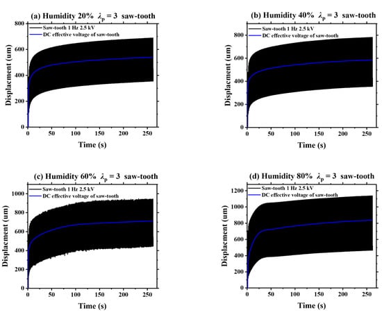 Comparison of the displacements between the effective DC signal and the saw-tooth signal under different ambient humidities.