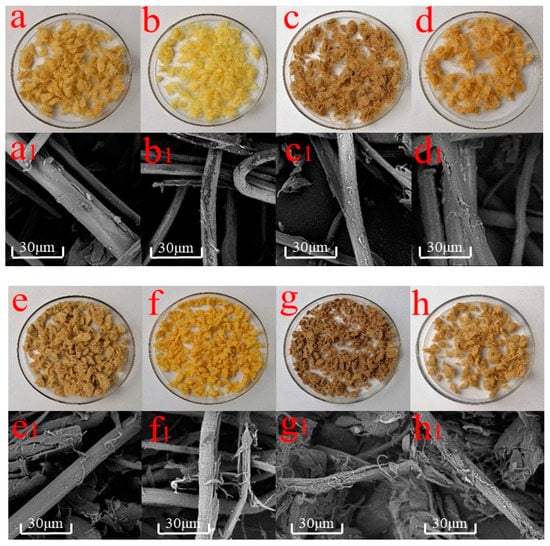 Figure 1. Photographs/SEM images (×2000) of samples: (a,a1) hydrogen peroxide mechanical pulp (APMP) APMP; (b,b1) H-APMP; (c,c1) F-APMP; (d,d1) E-APMP; (e,e1) sulfonated chemical mechanical pulp (SCMP); (f,f1) H-SCMP; (g,g1) F-SCMP; (h,h1) E-SCMP; (i,i1) chemical thermomechanical pulp (CTMP); (j,j1) H-CTMP; (k,k1) F-CTMP; and (l,l1) E-CTMP.