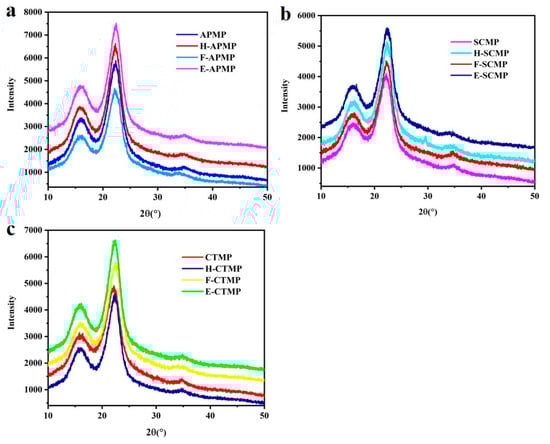 Figure 2. XRD analysis of the samples: (a) APMP samples, (b) SCMP samples, and (c) CTMP samples.