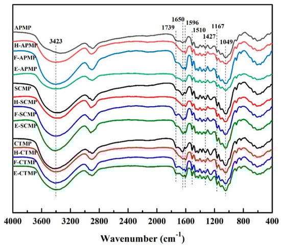 The FTIR analysis of the different high-yield bamboo mechanical pulps (HBMP) is shown in Figure 3. The FTIR peak intensity was calibrated using the peak at 1110 cm−1 as a reference peak. The stretching vibration peaks at 3423 cm−1 were assigned to the hydroxyl and phenolic hydroxyl groups [31,32], and the stretching vibration peaks at 1739 cm−1 were assigned to non-conjugated carbonyl groups [33,34]. The adsorption peak at 1596, 1510, 1462, and 1427 cm−1 were assigned to the CH plane bending vibration of skeleton structure of aromatic ring in lignin [35,36].