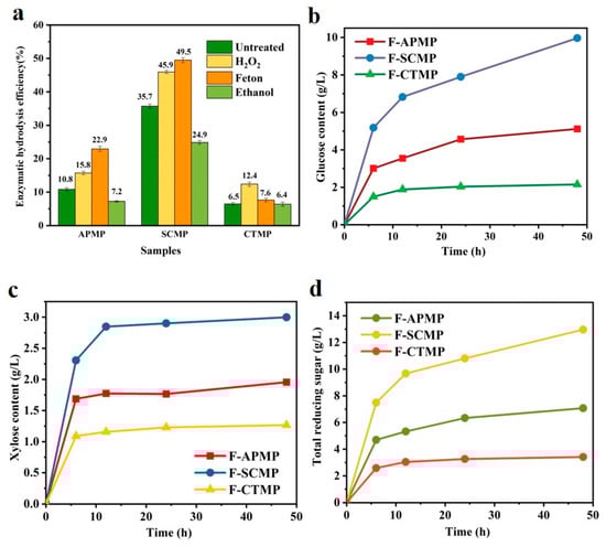 The SO32− attached to the lignin increased the hydrophilicity of lignin, decreased the hydrophobic interaction between lignin and cellulase, and may also increase the enzymatic hydrolysis. The glucose and xylose content in the enzymatic hydrolysate of HBMP are shown in Figure 4b,c, the glucose and xylose content of HBMP increased with the enzymatic time, and the glucose and xylose contents of F-SCMP were higher than for F-APMP and F-CTMP. The increased glucose and xylose content of HBMP resulted in the increase of the total reducing sugar (Figure 4d).