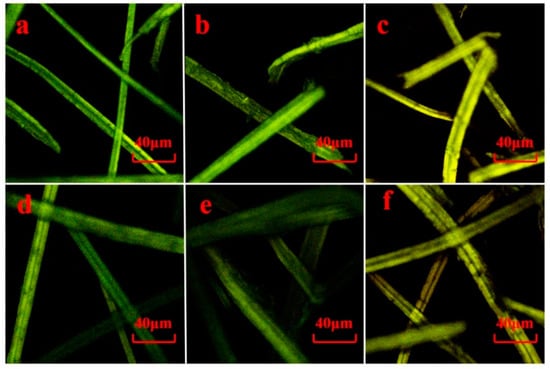 The fluorescence characteristics of the fiber surface was determined by the confocal laser scanning microscope (CLSM, Zeiss company LSM880, Oberkochen, Germany). We fixed the sample on the glass slide, 0.1 mL of distilled water was dripped on the sample, and then we covered the slide with a coverslip, dried the sample at room temperature, and then placed the sample on the CLSM sample stage for observation. The CLSM objective lens was 40X, the excitation wavelength was 488 nm, and the collection range of the emission spectrum was 500–550 nm (green), 550–600 nm (yellow), 600–650 nm (red), respectively.