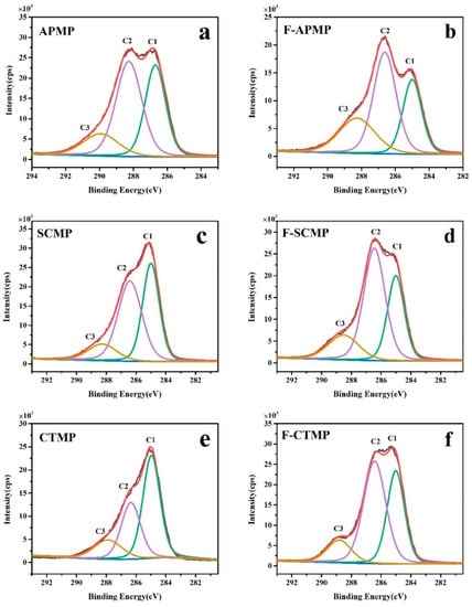 The change of SLC was confirmed by the analysis of the C1s peak, as shown in Figure 6. The composition of C1s is shown in Table 4. The C1 was mainly derived from the lignin and extracts [43]. Compared to APMP, SCMP, and CTMP, the proportion of the C1 peak of F-APMP, F-SCMP, and F-CTMP decreased by 45.50%, 23.21%, and 0.77%, respectively, which was consistent with the change of SLC.
