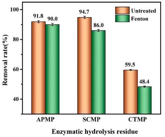 To effectively use the residual solids after enzymatic hydrolysis, the methylene blue (MB) was adsorbed by the enzymatic hydrolysis residue (EHR), as shown in Figure 7. The MB removal rates of the APMP, SCMP, and CTMP EHR were 91.8%, 94.7%, and 59.5%, respectively. The MB removal rates of Fenton-pretreated APMP, SCMP, and CTMP EHR were 90.0%, 86.0%, and 48.4%, respectively.