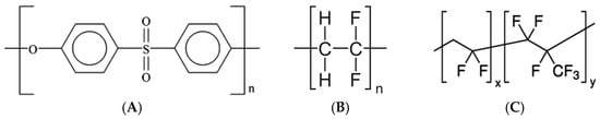 The structure of (A) Poly(ethersulfone) (PES), (B) Poly(vinlidine fluoride) (PVDF), and (C) Poly(vinlidine fluoride-co-hexafluoropropylene) (PcH) polymers.