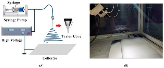 (A) A schematic diagram of the electrospinning process [] and (B) A photo of the fabricated membrane before the post-treatment.