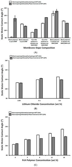 The hydrophilicity of the prepared pure PES, pure PcH, and blended membranes was measured using the static water contact angle and was presented in Figure 3A. The presence of NMP traces on the membrane surface may affect the measured contact angle, as it was illustrated recently that the NMP concentration is dependent on the water contact angle of NMP/water mixed droplets on the PVDF sheet [,]. This previous work reported a contact angle of around 81°, that is very close to the determined contact angle (82.2°) in this work, of a blend polymer prepared by using pure NMP solvent followed by drying at 60 °C. This value increased to around 132.2° after the complete removal of the NMP solvent using the phase inversion post-treatment immediately after the electrospinning process [,]. As shown in Figure 3, the lowest measured static water contact angle value (95° ± 0.49) was measured for pure PES prepared using a 1 NMP:9 DMF solvents mix and post-treated by heating at 60 °C, while the highest static water contact angle value (151.8° ± 4.49) was measured for 14 wt.% PES/4 wt.% PcH blend membrane. This membrane was prepared using a 1 NMP/9 DMF solvents mix and post-treated by phase inversion at 40°C and without LiCl additive, which showed a beads-rich membrane microstructure as described in the following sections, that is associated with the thick (0.13 µm) and low porosity (68.4% ± 5.7) membrane.