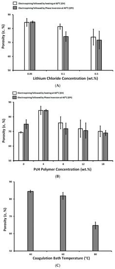 Membrane porosity as a function of Lithium chloride concentration (wt.%; A), PcH polymer concentration (wt.%; B), and coagulation bath temperature (°C; C).