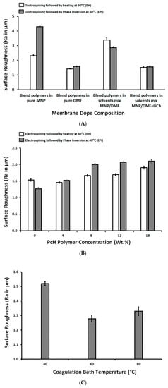 Surface roughness as a function of membrane dope composition (wt.%; A), as a function of PcH polymer concentration in the membrane dope (wt.%; B), and as a function of coagulation bath temperature (°C; C).