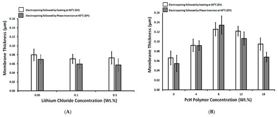 The thickness of the prepared membranes was in the range of 0.04–0.14 µm (see Figure 6). As shown in Figure 6A, the concentration of LiCl had no significant effect on the formed membrane thickness with an average thickness range of 0.07 µm. The phase inversion post-treatment resulted in a slightly lower measured thickness average, of around 0.06 µm. This reduction in the thickness can be attributed to removing the residual solvents that may swell the polymer fibers, with a slight increase in the measured thickness in the case of a post-treated membrane by heating at 60 °C.
