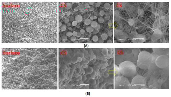 SEM images of PcH/PES blend membranes that were prepared using a 1 NMP: 9 DMF solvents mix and were treated by (A) heating at 60 °C and (B) phase inversed at 40 °C with LiCl additive. Surface images at ×10,000 and cross section images at ×2000 and ×10,000 were done.