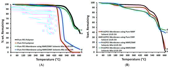 TGA of pure polymers (A) and blend PcH/PES membranes (B) using pure and/or mixed solvents.