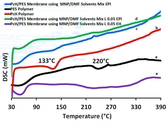 Differential scanning calorimeter (DSC) analysis of PES polymer (a), PcH polymer (b) PcH/PES blend membrane using a NMP/DMF solvents mix without LiCl post-treated by heating at 60 °C (c) and with LiCl post-treated by phase-inversion at 40 °C (d) and by heating at 60 °C (e).