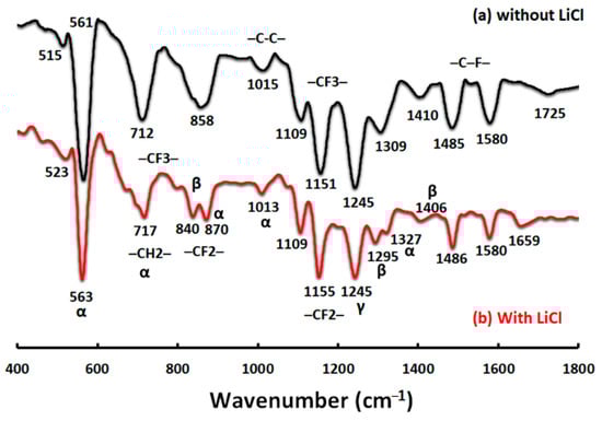 Fourier transfer infrared spectroscopy-attenuated total reflectance (FTIR-ATR) analyses of blend PcH/PES membranes using a NMP/DMF solvents mix without (a) and with (b) LiCl additive.