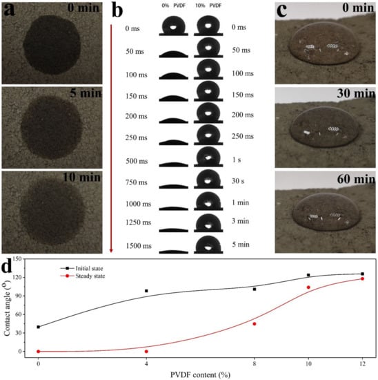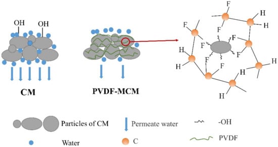 - Binding: Fluorinated chain segment shields the polarity of polar groups, which makes the surface of PVDF hydrophobic. At the same time, the surface energy of the PVDF membrane is low, which leads to the poor wettability of the membrane. PVDF has good cementation and can fill the pores of CM, which effectively increases the bond strength of CM particles and solidifies the particles into a new whole [56,57].