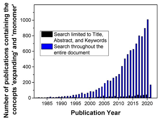 Evolution of the number of publications addressing the concepts of “expanding” and “monomer” during the last three decades. Literature search in the Scopus database on 13 February 2021.