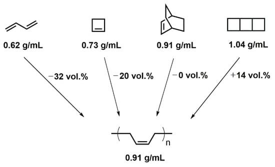The density of 1,3-butadiene (0.62 g·mol−1; no ring present) [8], cyclobutene (0.73 g·mol−1; 1 ring present) [9], bicyclo[2.2.2]oct-2-ene (0.91 g·mol−1; 2 rings present) [10], and tricyclo[4.2.0.02,5]octane (1.04 g·mol−1; 3 rings present) [11] increases alongside with the number of rings present in the molecular structure, indicative of a comparably dense atomic packing in the rings. Theoretical consideration of polymerizations of these “monomers” with the molecular formulae of (C4H6)n (n = 1, 1, 2, 2) yielding poly(butadiene) with the molecular formula of (C4H6)∞ (density of 0.91 g·mol−1) [12] reveals that the polymerizations of 1,3-butadiene and cyclobutene would experience volumetric shrinkage, while the polymerization of bicyclo[2.2.2]oct-2-ene would proceed in volume-neutral fashion and only that of tricyclo[4.2.0.02,5]octane would show volumetric expansion.