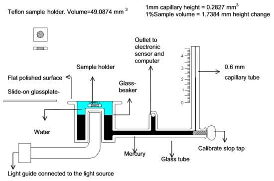 In capillary type dilatometers, a sample of the uncured resin or composite is surrounded by a liquid (typically mercury [21] or water [22]), which does not react and is immiscible with the resin (Figure 3). By monitoring the height of the liquid in the capillary, the volumetric changes during polymerization can be monitored [23]. Hence, capillary dilatometers enable the time-resolved monitoring of volumetric changes during the curing reaction.