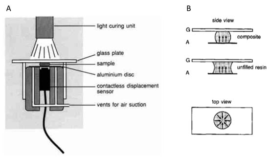 (A): Schematic set-up of a linometer. (B): Side and top view of the shape of a composite and unfilled resin sample placed between the glass slide and aluminum disk of a linometer. Both pictures (referred to as (A,B)) constituting this Figure 6 have been reprinted from reference [28] with permission from Elsevier.