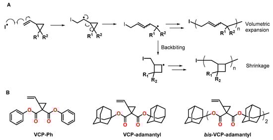 2-Vinylcyclopropanes are monomers that can be subjected to radical ring-opening polymerizations RROPs with low shrinkage compared to linear vinyl monomers [45,46]. The RROP is initiated by the addition of a radical species to the vinylic double bond, followed by ring-opening involving the formation a carbon-carbon double bond and a propagating radical species (Figure 7A). The formation of polymers with ring-opened units provides volumetric expansion during the RROP, while the by-reactions, namely backbiting and the formation of cyclobutane units, cause volumetric shrinkage. In consequence, most vinylcyclopropanes exhibit shrinkage; nonetheless, some examples of monomers with bulky substituents have been reported to undergo volumetric expansion during polymerization (Figure 7B).