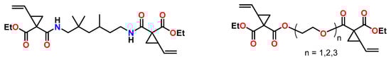Argawal and coworkers compared the thermally triggered and photo-initiated RROP of 1,1-bis(ethoxycarbonyl)-2-vinylcyclopropane [50]. During photopolymerization, a significantly reduced formation of cyclobutane units and, correspondingly, increased extent of ring-opening reactions was observed in comparison to thermal polymerization. Hence, the shrinkage of 11.2 vol.% during the thermally induced RROP could be reduced to 5.5 vol.% during photopolymerization.