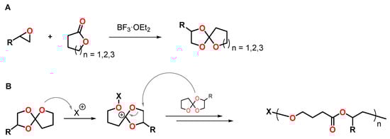 Spiroorthoesters SOEs are conventionally synthesized by the reaction of lactones with epoxides in the presence of boron trifluoride diethyl etherate BF3·OEt2 as catalyst (Figure 10A) [61]. After the report of Bailey et al. of the polymerization of spirocyclic compounds upon volumetric expansion in the 1970s, SOEs have gained increased attention as expanding monomers, and numerous studies on the synthesis and polymerization of SOEs were published [13,15]. In the presence of Bronsted and Lewis acids, SOEs polymerize by cationic double-ring opening reaction, yielding poly(ether ester)s (Figure 10B). For the polymerization of seven-membered SOEs at low temperatures, single ring-opening polymerization upon the formation of poly(cyclic orthoester)s was reported [62]. At temperatures above 100 °C, the poly(cyclic orthoester)s undergo isomerization yielding poly(ether ester)s.