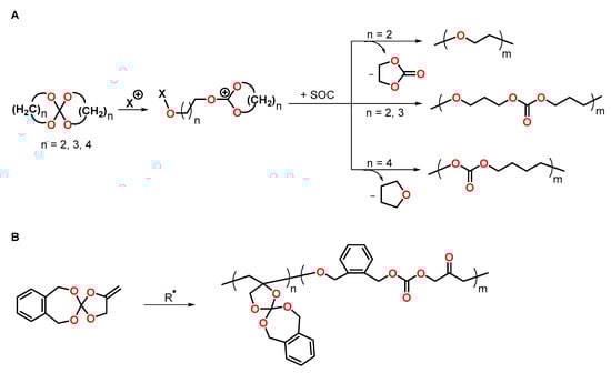 (A): Schematic representation of the cationic ring-opening polymerization of SOCs. (B): Schematic representation of the radical polymerization of SOCs bearing exo-methylene groups.