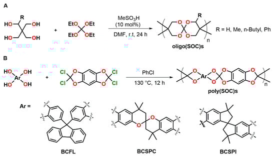 The synthesis of oligo(spiroorthocarbonate)s by polycondensation of pentaerythritol derivatives and tetraethyl orthocarbonate was reported by Endo and coworkers (Figure 15A) [85]. Oligomers with a Mn in the range of 1.1 to 1.3 kDa and dispersity indices in the range of Đ = 1.66 to 1.96 were obtained. The solubility is strongly dependent on the substituent R (Figure 15A). While the oligomeric SOC with R = H was completely insoluble, the introduction of methyl, n-butyl and phenyl groups provided solubility in common organic solvents.