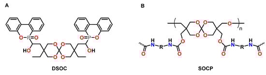 Xu et al. synthesized novel phosphorous-containing SOCs DSOCs as anti-shrinkage additive and flame-retardant for epoxy resins (Figure 16A) [88]. The DSOC was copolymerized with the DGEBA-based epoxy resin E51 at 150 °C in the presence of boron trifluoride triethylamine BF3·NEt3 as catalyst. During crosslinking, volumetric changes in the range from −1.49 to +1.43 vol.% were observed if the content of DSOC was increased from 0 to 20 wt.%. The limiting oxygen index LOI values increased from 19.9% for the epoxy resin to 30.9% for the resin containing 20 wt.% DSOC.