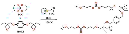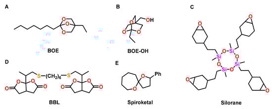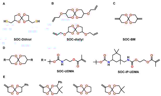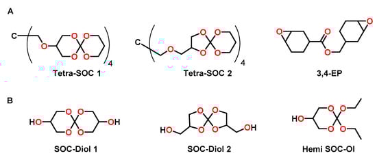 The group of Endo investigated the cationic copolymerization of oligomeric SOCs (Figure 15A) with DGEBA [87]. The copolymerization was performed at 180 °C for 1 h in the presence of sulfonium salts as cationic initiators. The methyl-substituted SOC showed higher shrinkage reduction compared to other SOCs. While pure DGEBA showed shrinkage of 3.1 vol.%, mixtures with 1 and 10 mol% of the methyl-substituted oligo-SOC exhibited shrinkage of only 1.2 and expansion of +0.1 vol.%, respectively. The copolymer networks containing oligo(SOC)s showed a similar temperature stability like the DGEBA homopolymer.