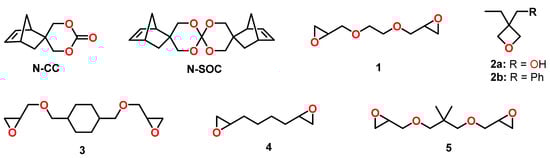 - Hino, T.; Inoue, N.; Endo, T. Cationic copolymerization behavior of cyclic ether monomers with norbornene-containing cyclic carbonate or spiro–orthoether structure. J. Polym. Sci. Part A Polym. Chem. 2004, 42, 5113–5120. [Google Scholar] [CrossRef]