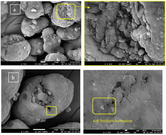 Particles after laser processing all three remaining samples, had smoother a melted-like surface character that can be connected to the conditions of the printing process [15]. The temperature of printing condition changes the character of cracks, and visible thin bridges are observed on the cracks’ ends (Figure 1b detail in yellow rectangle). The particles of sample recycled PA12 (Figure 1c) consist of the same particles as scrap PA12 (Figure 1b) particles; however, the uniformity regarding the size achieved via the sieving process is evident. The sample of renewed PA12 (Figure 1d) contained places where a relatively high concentration of small particles less than 10 μm size flocked to the common big particles was observed. This phenomenon might be caused by electrostatic forces created during renewing the PA12 powder, where mixing of recycled and fresh powder is taking place. “For a polymer particle of diameter about 10 µm (i.e., R = 5 µm) resting on a rigid surface, the magnitude of van der Waals forces may vary from 10 to 500 nN depending upon the particle surface properties” [16]. The electrostatic interactions with significantly charged dielectric particles may considerably affect the apparent cohesion of the powder material, where the electrostatic image force can also be a key participant.