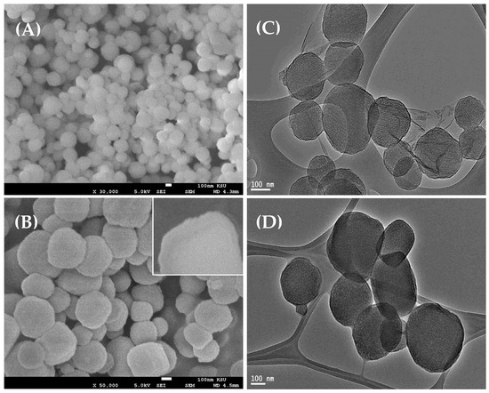 SEM and TEM images of fabricated mesoporous silica nanoparticles: (A) SEM image of unmodified MSNs, (B) SEM image of PDEAEMA-attached MSNs, (C) TEM image of as-made silica nanoparticles, and (D) TEM image of PDEAEMA-coated silica nanoparticles.