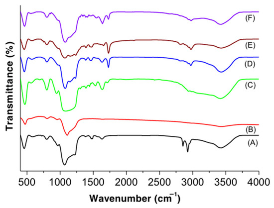 FTIR spectra of the modified silica nanoparticles: (A) as-made MSNs, (B) hexadecyltrimethylammonium bromide (CTAB)-free MSNs, (C) MSN–Br, (D) MSN-PDEAEMA, (E) MSN-PDEAEMA-cysteine (Cys), and (F) MSN-PDEAEMA-Cys-POEGMEMA.