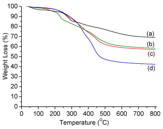 Thermogravimetric analysis (TGA) of the modified silica nanoparticles: (a) MSN-Br, (b) MSN-PDEAEMA, (c) MSN-PDEAEMA-Cys, and (d) MSN-PDEAEMA-Cys-POEGMEMA.