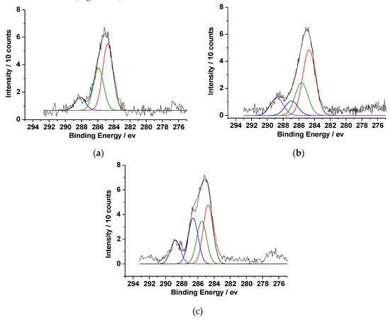 X-ray photoelectron spectra at the C1s region for (a) MSN-PDEAEMA, (b) MSN-PDEAEMA-Cys, and (c) MSN-PDEAEMA-Cys-POEGMEMA.