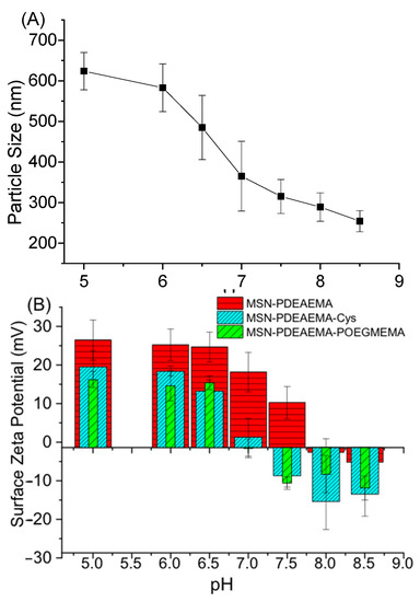 (A) The average particle size of MSN–PDEAEMA at different pH levels at 25 °C. (B) The surface zeta potential MSN-PDEAEMA, MSN-PDEAEMA-Cys, and MSN-PDEAEMA-Cys-POEGMEMA at different pH levels at 25 °C.