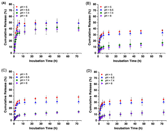 Drug release profiles of doxorubicin (DOX) loaded in (A) MSN-Br, (B) MSN-PDEAEMA, (C) MSN-PDEAEMA-Cys, and (D) MSN-PDEAEMA-Cys-POEGMEMA nanocarriers with different pH values at 37 °C.