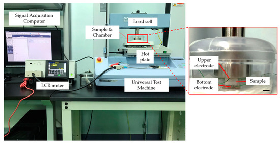The system utilized to measure the mechanical properties and sensing performance of the capacitive pressure sensor is shown in Figure 2. The sensor based on the PU porous structure was positioned within a specially designed chamber, then placed on a hot plate (IKA C-MAG7, IKA-Werke GmbH & Co. KG, Staufen, Germany). The chamber helps maintain the required temperature (Figure S1). The pressure universal test machine (AGS-X, Shimadzu, Japan), with a load cell, was used (maximum load of 1 kN, resolution of 2 N) at a compression speed of 10 mm min−1. The capacitance was measured with an LCR meter (HIOKI-3536, HIOKI, Nagano, Japan) at 500 kHz and 1 V bias. The sensor evaluation data were acquired in real time by a computer connected to the LCR meter. A thermal image of the insole evaluation was captured using a thermal image camera (A700-EST, FLIR, Wilsonville, OR, USA)).