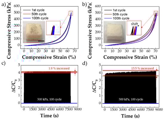 Comparison between the shape memory polymer (SMP) and CF95 porous structures. (a) Stress–strain curve of the SMP porous structure for 100 cycles of 500 kPa load; scale bar = 10 mm. (b) Stress–strain curve of the CF95 porous structure for 100 cycles of 500 kPa load. (c) Relative capacitance of the SMP porous structure for 100 cycle. (d) Relative capacitance of the CF95 porous structure for 100 cycles.