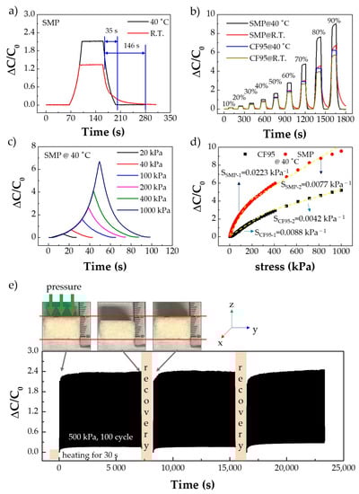 To investigate the recovery properties of the SMP over the glass transition temperature, we evaluated the response time of the PU porous structure-based sensor. A pressure of 100 kPa was applied to and then removed from the pressure sensor, and the capacitance values were recorded (Figure 4a). At room temperature (R.T., 21.9 °C, below the glass transition temperature), the SMP-based sensor showed a long response time of 146 s after the pressure was released. However, at 40 °C, the sensor showed a relatively stable and fast response time of 35 s, with negligible hysteresis. Additionally, the sensor performance at over 40 °C is shown in Figure S3. This is attributable to the restorative properties of the SMP-based sensor. It can, therefore, be anticipated that the response characteristics and sensitivity of the sensor are improved at 40 °C, and the sensor could be applied to systems operating at 40 °C. Additionally, Figure 4b shows the response times for SMP- and CF95-based sensors at two temperatures (R.T. and 40 °C) under changing strain conditions. Below 30% strain, the capacitance values of the sensors at the two temperatures were identical. However, after 30% strain, the difference increased; at 40 °C, the SMP-based sensor showed a fast response time and high sensitivity. The sensitivity can be changed by varying the compressibility, initial porosity, and dielectric constant [6]. In the case of Figure 4b, the compressibility is the same because all sensors were compressed under the same strain. Additionally, the initial porosity was also assumed to remain constant as only one type of sugar cube was used. Therefore, the change in the dielectric constant causes the sensitivity change. After 30% strain, the difference in the capacitance values at R.T and 40 °C was much larger for the SMP sensor than for the CF95 sensor. Thus, the sensing properties of the SMP can be improved by increasing the temperature to 40 °C. Figure 4c shows the capacitance values of the SMP-based porous pressure sensor during applied loading and unloading (at the same stress rate) at 40 °C. The sensor showed relatively stable capacitance values under differing pressure conditions (20, 40, 100, 200, 400, and 1000 kPa). Next, the sensor sensitivity as a function of pressure was studied. The sensitivity was calculated by