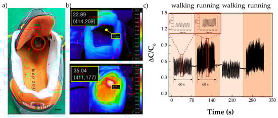 Application of the proposed sensor over a high pressure range; (a) SMP porous structure sensor on the shoe insole, scale bar = 20 mm; (b) Temperature in the shoe before the experiment and after the experiment; (c) Signal data of walking and running for 60 s.