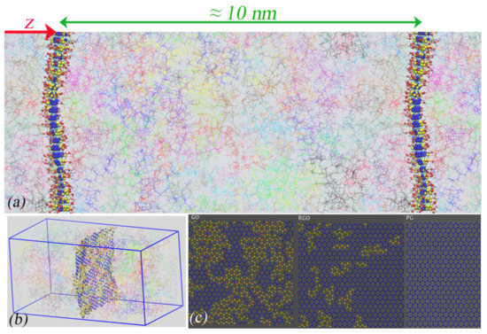 Atomistic molecular dynamics (MD) simulations have been carried out on unentangled stereoregular (i-PMMA, s-PMMA) and atactic (a-PMMA) melts confined between PG, RGO, or GO surfaces. The PMMA chains contain 20 chemical repeat units ( ≈ 1 nm). The simulation box dimensions are approximately nm along x, y, and z directions, respectively. A single, periodic, and flexible PG, RGO, or GO sheet was placed in the simulation box, parallel to the plane, and periodic boundary conditions were applied along all directions. The periodic boundary conditions make the model geometry as a multi-layered film containing alternating ≈10 nm thick layers of PMMA confined between infinite sheets. The degree of the confinement of the model chains in the model geometry is rather moderate: , where D is the film thickness. The numbers of basal carbon atoms of the model PG, RGO, and GO sheets are equal; however, because of the presence of the functional groups, RGO and GO are heavier than PG. The weight fractions of PG, RGO, and GO in the model systems are , , and wt %, respectively; also their estimated volume fractions are , , and vol %, respectively. Snapshots of the simulation box and the model nanosheets are provided in Figure 1.