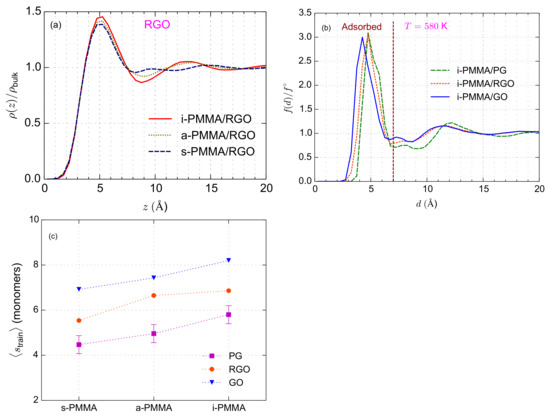 (a) Interfacial mass density profiles for PMMA stereoisomers near RGO. In this panel, corresponds to the center-of-mass of RGO. (b) Distribution of (minimum) distance between monomer centers-of-mass and nanosheet atoms for i-PMMA close to the model surfaces. (c) Weighted average number of monomers that belong to a train (or weighted average size of trains) for PMMA stereoisomers adsorbed on the model surfaces. The data are calculated at K. More details are provided in a previous work [35].