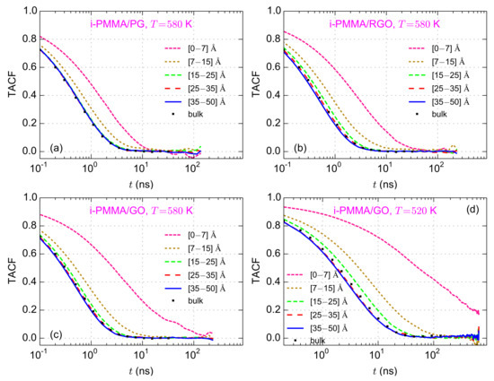 The layer resolved TACF curves for i-PMMA melts confined between PG, RGO, and GO, at K, are plotted in Figure 3a–c; the TACF curves for i-PMMA/GO system at K are depicted in Figure 3d (the layer resolved TACF curves for the confined i-PMMA melts at K and some of the model s-PMMA containing confined systems are provided in Figures S1 and S2 of the Supplementary Materials). For all model systems, a gradient of segmental mobility is observed. TACF curves for PMMA segments being closer to the model surfaces decay slower than those that are far away. The decelerations of the backbone torsional motions for the first and the second studied layers, i.e., up to nm from the surfaces, are significant. In addition, for the PMMA chains near GO and RGO, even at the third layer (distances between nm to nm) the segmental dynamics is slightly slower than that of the bulk melt. At the center of the films, the torsional mobility is rather close to that of the respective bulk melts. To quantify the mobility gradient at the interface, the TACF curve of each layer has been fitted with a stretched exponential, Kohlrausch–Williams–Watts (KWW), function and the relaxation (or correlation) time of the backbone torsional motions, , has been calculated as the integral of the KWW function. The KWW function is defined as [47]: