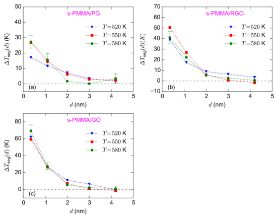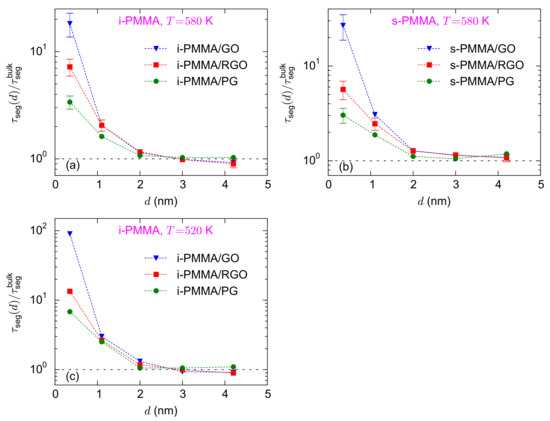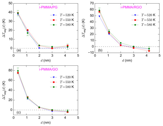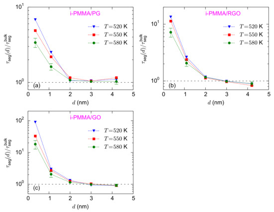 Figure 5a–c shows the temperature dependence of the normalized interfacial segmental relaxation times for the i-PMMA/PG, i-PMMA/RGO, and i-PMMA/GO systems. At the interfacial region (distances less than 2 nm), the values of increase with decreasing temperature. For the adsorption layer of the i-PMMA/GO system, the values of are , , and at 580 K, 550 K, and 520 K, respectively (Figure 5c). The increase of , for small values of d, with decreasing temperature shows the stronger temperature dependence of the interfacial segmental dynamics as compared to dynamics of the respective bulk melts, for the temperature range studied here, well above the bulk Tg. The temperature dependence of the interfacial dynamics for the s-PMMA/PG, s-PMMA/RGO, and s-PMMA/GO systems are provided in Figure S3 (of the Supplementary Materials); it seems that the temperature dependence of s-PMMA containing interfacial systems is qualitatively similar to that of i-PMMA containing ones; however, the results for the former cases are rather scattered and their temperature dependency is not as clear as the results of i-PMMA systems.